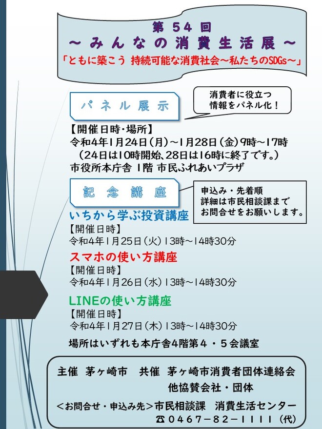 [画像]消費生活展および記念講座(144.9KB)第54回みんなの消費生活展は「ともに築こう 持続可能な消費社会〜私たちのSDGs〜」をテーマに
