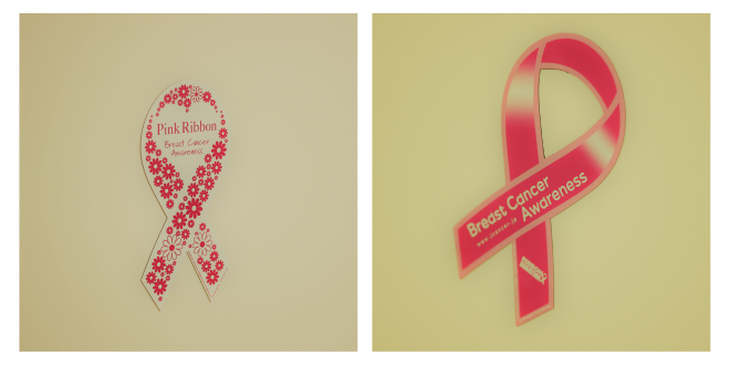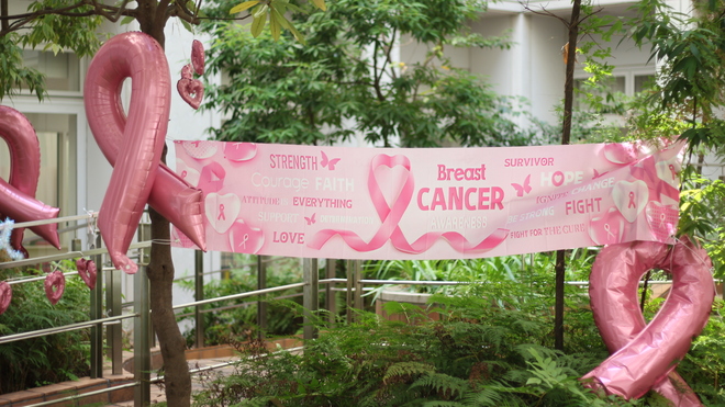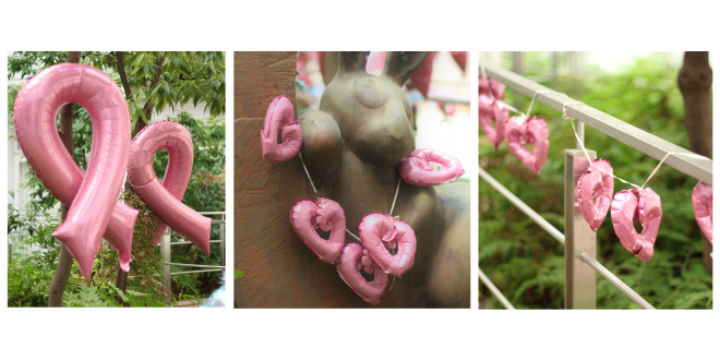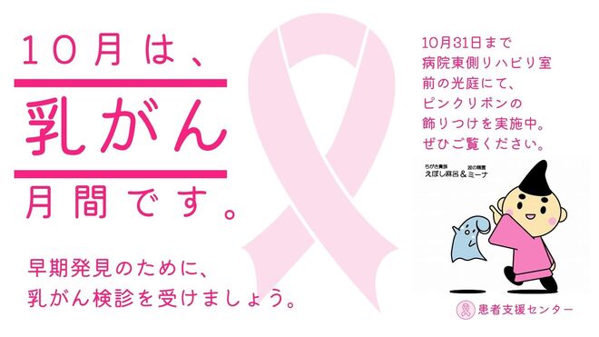 茅ヶ崎市立病院では、ピンクリボンのシンボルを通して乳がんについて考えるきっかけづくりに、中庭の飾りつけを実施しました。