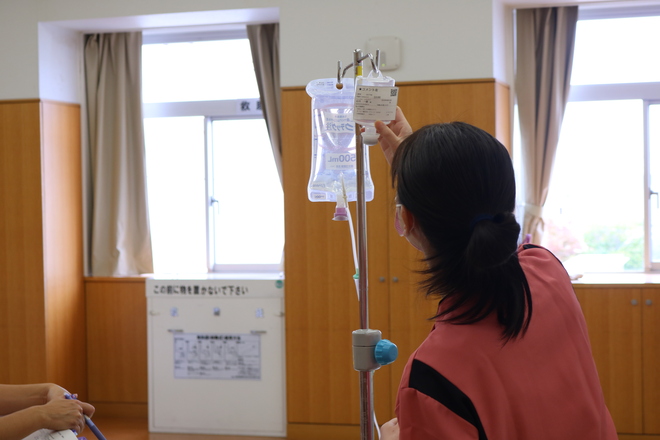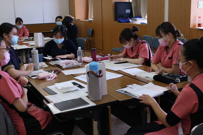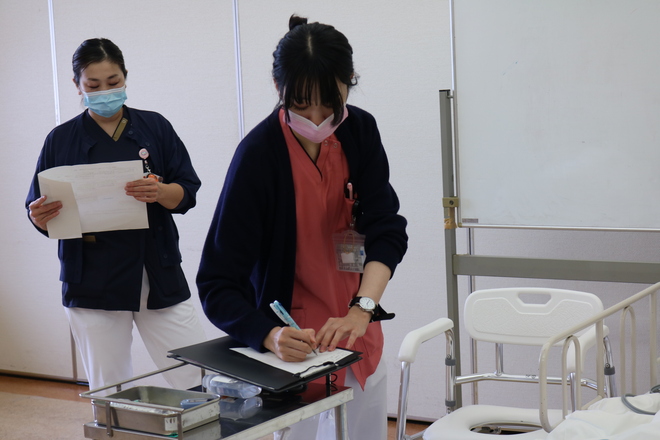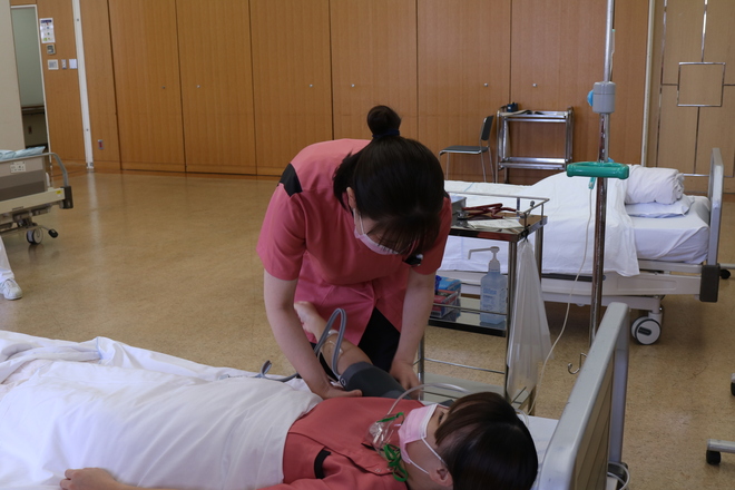 模擬患者の情報から優先順位を考え、確認作業や状態観察を基本に則り、行いました。