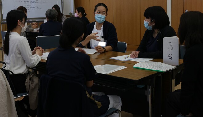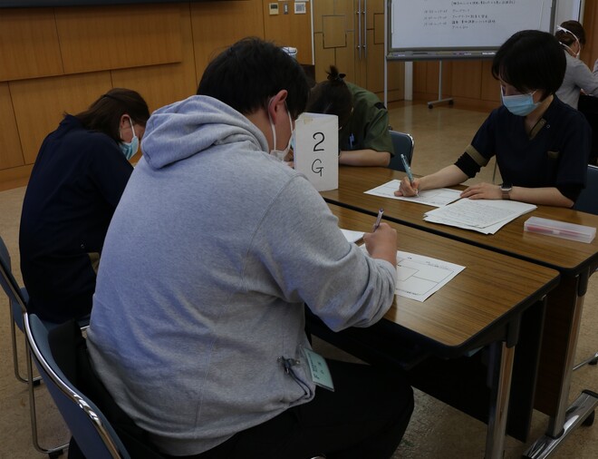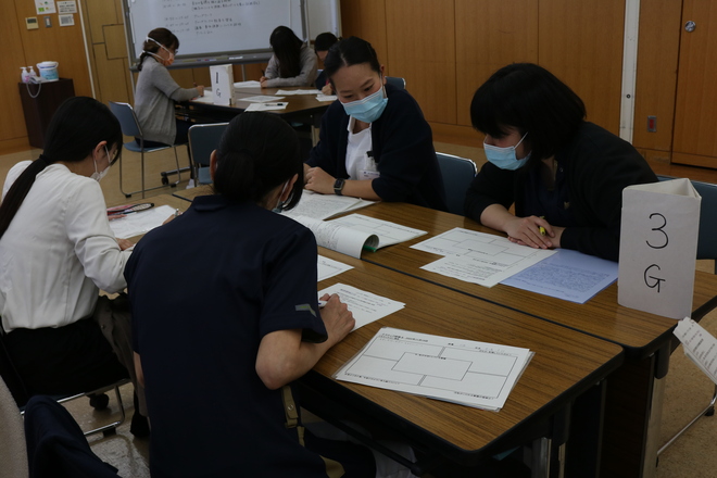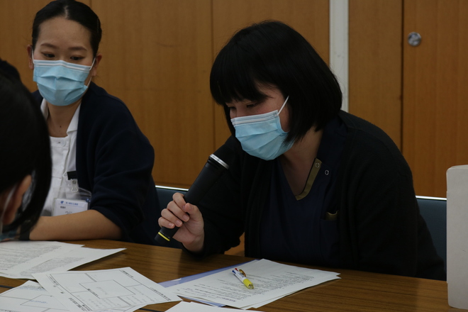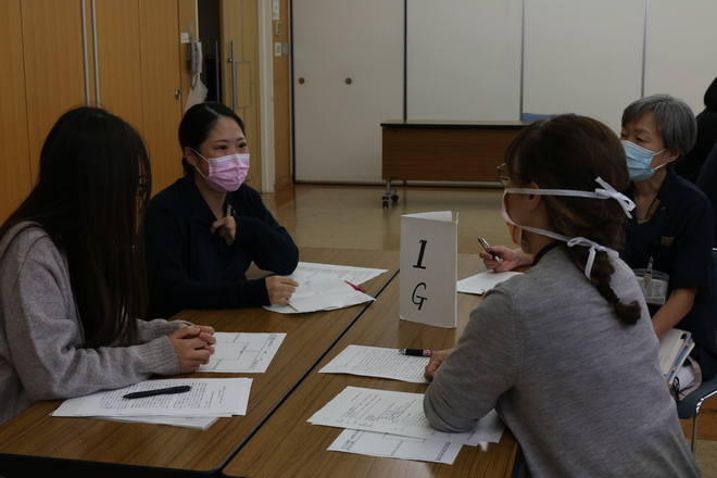 それぞれ部署が違う職員が集まり、自分の看護実践を振り返るとともに他者の体験や感情を聞くことができるよう工夫されていました。