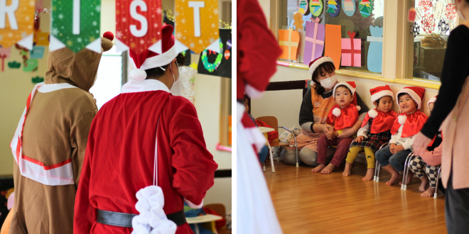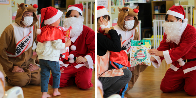 茅ヶ崎市立病院には職員のお子さんのための病院保育室と、入院中のお子さんのための病棟保育室があります。クリスマスを迎え、それぞれの保育室と小児病棟に、サンタさんとトナカイさんがやってきました。