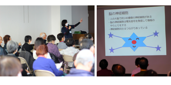 [画像]講義(241.3KB)認知症の種類や、加齢によるものわすれとの違い、認知機能を維持させるポイントなどをわかりやすく説明しながら、実際に参加者の方が日ごろから心掛けている習慣を共有する場面も。認知機能を鍛えるために、日々の生活に取り入れたくなるトピックが盛りだくさんで、時折笑いに包まれる一時間となりました。