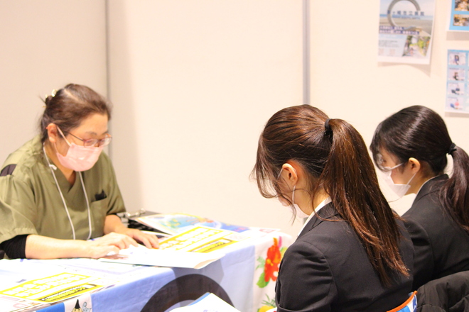 [画像]説明会の様子(195.5KB)県内、県外の病院が出展されている中、当院に興味を持っていただいた多くの学生さんが説明ブースにお越しいただきました。