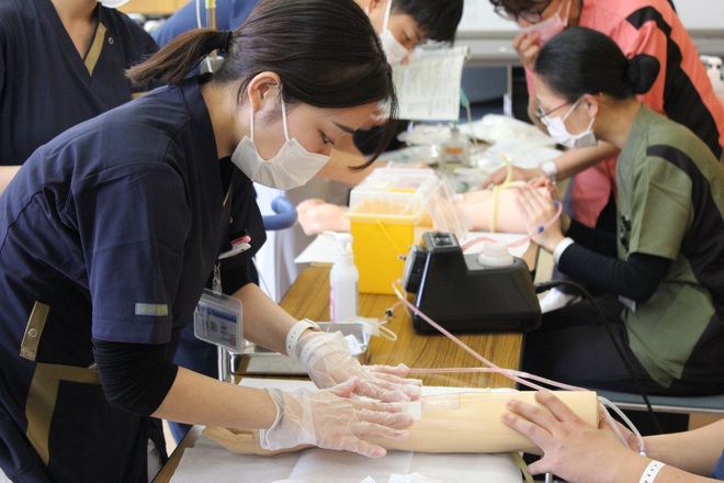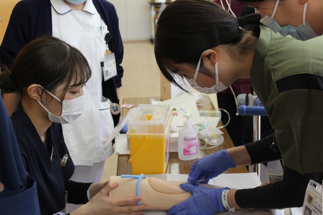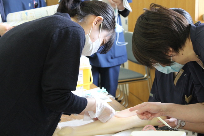 4月に実施している看護技術研修の様子です。研修動画で手順や注意事項を確認し、卒後研修委員会担当職員のサポートを受けながら、実践していきます。