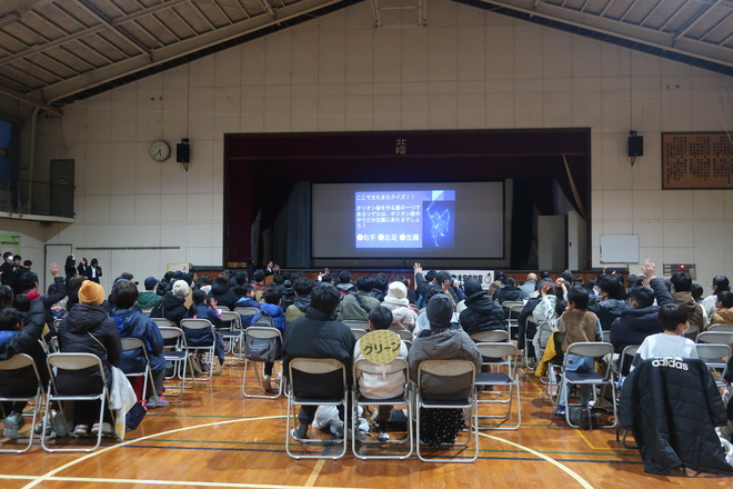 「遺跡の話し」では昔の人の生活に星がどのようにかかわっていたのかなどを学習し、「天体の話し」 では、天文部の生徒が作成したクイズを交えながら楽しく星座や天体について学習しました。 天体観測では、冬の寒い中でしたが、天気も良く澄み切った夜空のもと月、木星、土星、オリオン大 星雲を観察しました。土星は環(わ)を見ることができ、月ではクレーターまで見ることができウサギ を探す参加者もいました。