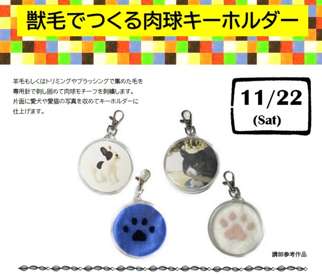 羊毛もしくはトリミングやブラッシングで集めた毛を専用針で刺し固めて肉球モチーフを刺繍します