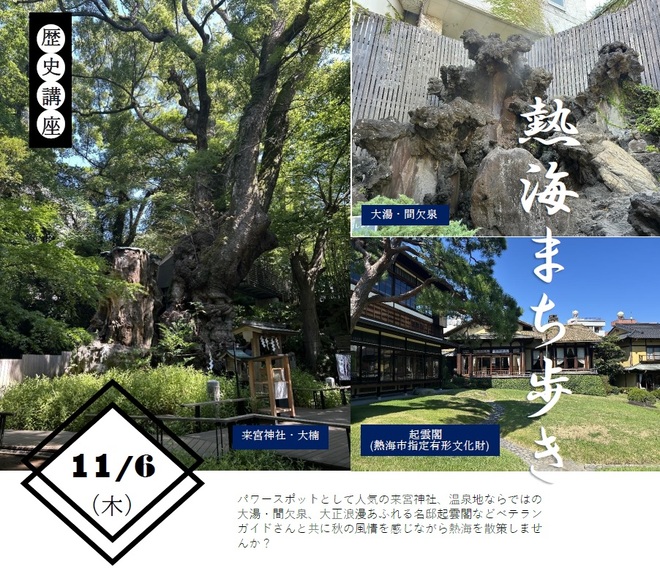JR来宮駅→来宮神社・大楠→大湯・間欠泉→起雲閣(熱海市指定有形文化財)