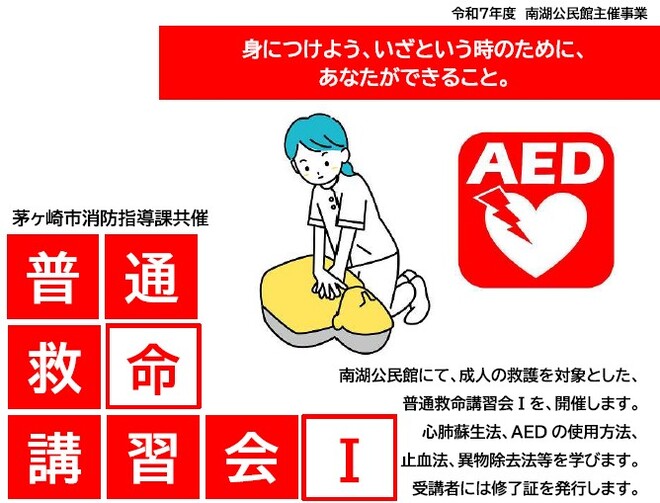 心肺蘇生法(成人)、AEDの使用方法・異物除去法・止血法などを学びます。受講者には修了証を発行します。